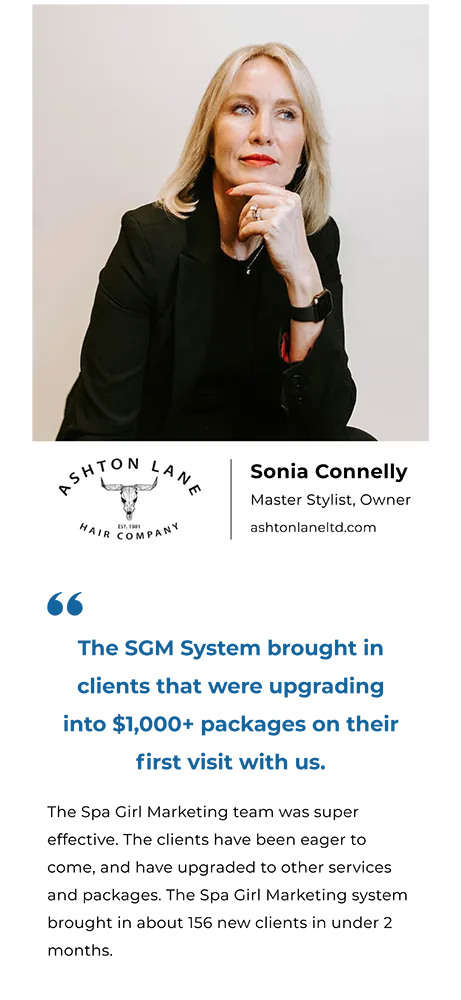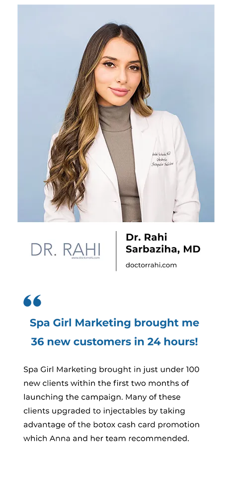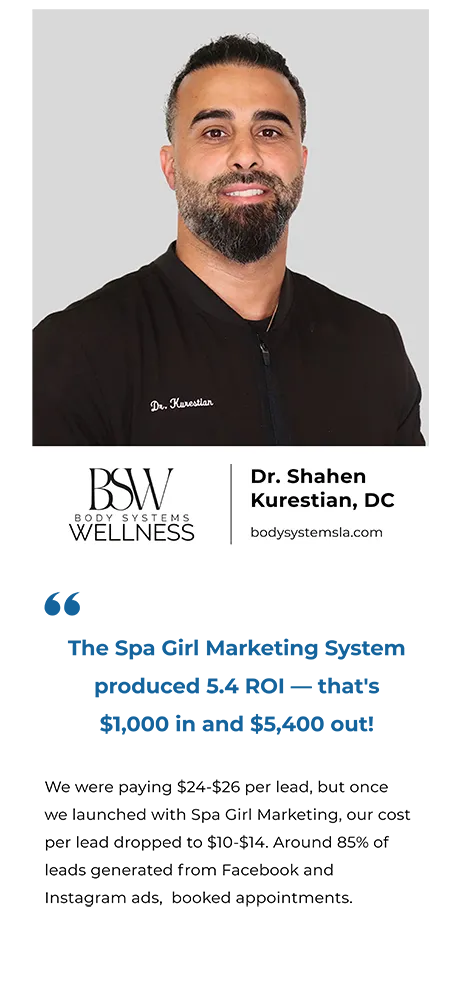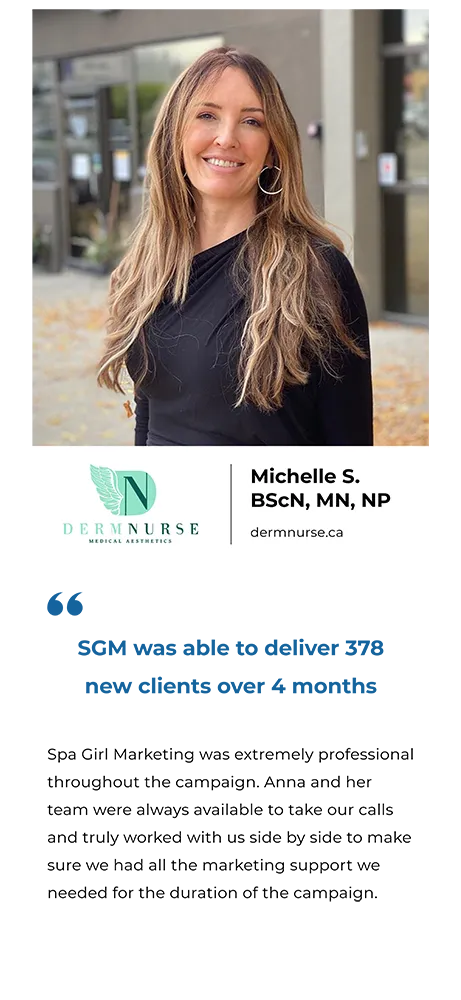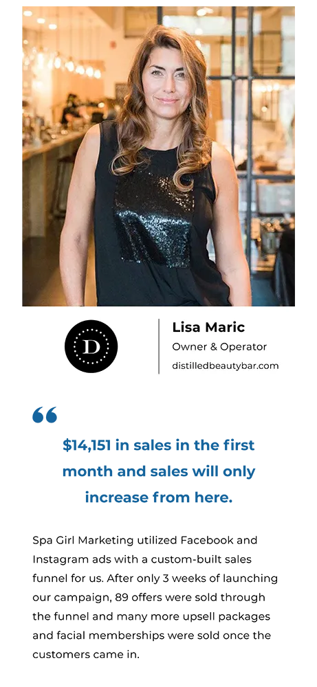 "We were paying $24-$26 per lead but once we launched with Spa Girl Marketing our cost per lead dropped to $10-$14. Around 85% of people were booking appointments."
